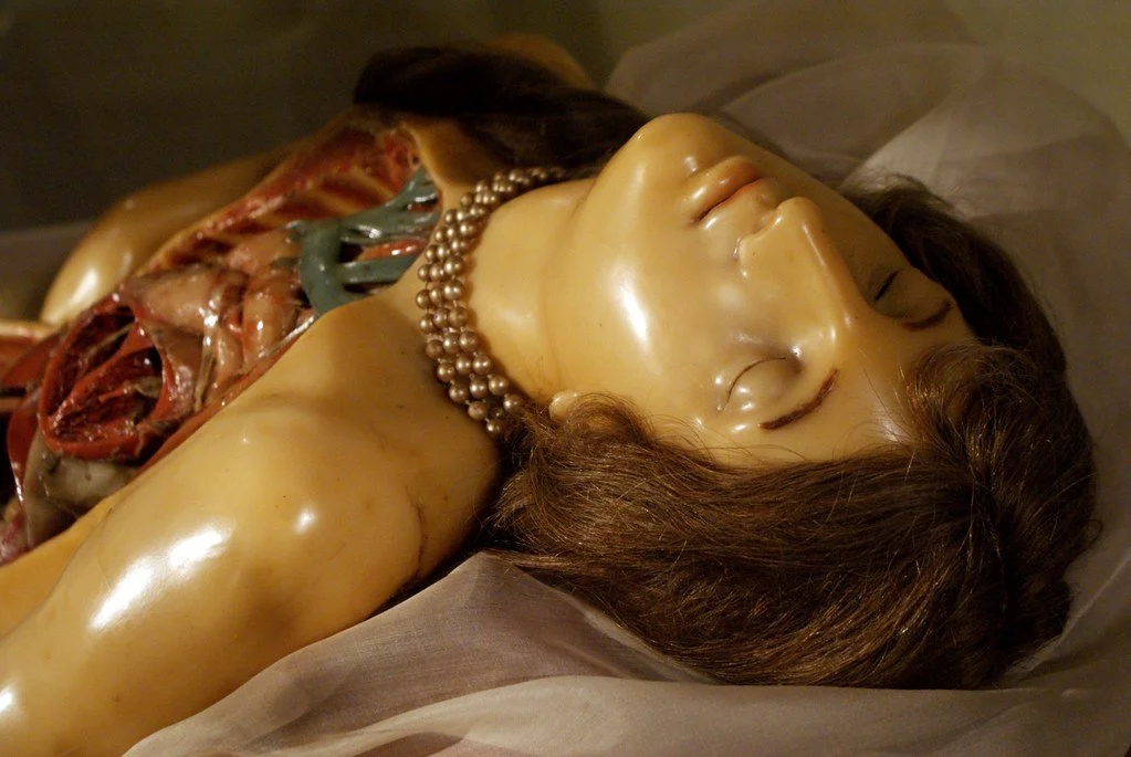 In 1755, Felice Fontana—the collaborator of the great Italian anatomist Leopoldo Marco Antonio Caldani—was called by the Grand Duke of Tuscany to create a Cabinet of Physics and Natural History in the Pitti Palace. This Museum, as well as those famously opened in Vienna, Montpellier, Bologna, Paris, and London, constituted an allegorical encyclopedia of fleshy fantasies. None more famous than the shamefaced Adam and Eve, depicted sexually-aware after the Fall, or the not-for-the- cold-blooded “Anatomical Venus” who appears to have died during love-making. Elegantly adorned [or, rather, tantalizingly undressed] in Rococo fashion, the latter is displayed—throat gorged, tight double-strand pearl necklace, blonde wig with head thrown back—in a taffeta-lined rosewood case crafted by Clemente Susini. i