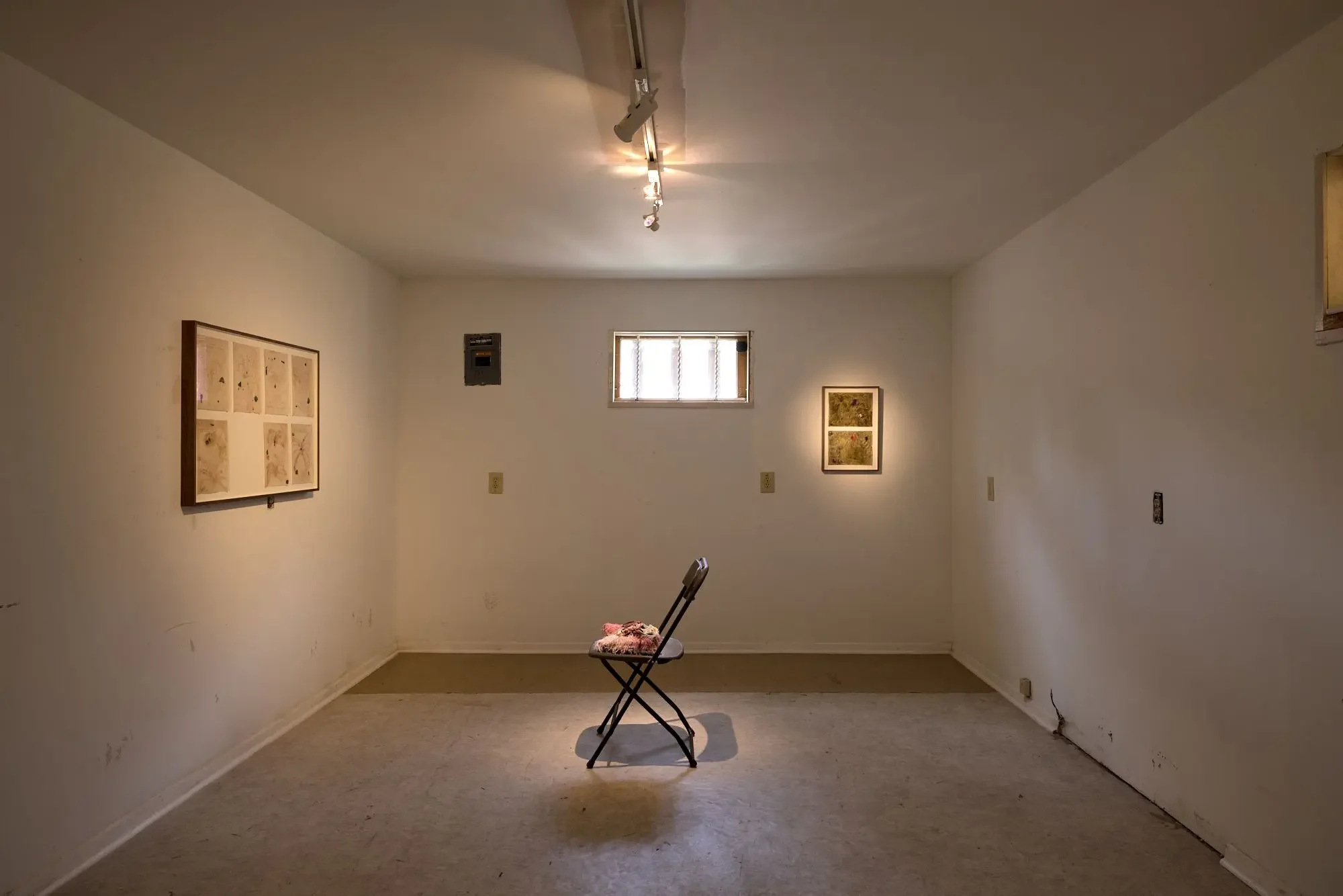 Apparently, once upon a time, this small outpost functioned as a community pharmacy :T he B Ruppe Drugstore in Albuquerque [founded in 1883 by a German immigrant] was subsequently moved many times to be reborn in 1985 as a yerberia only to close, finally, in 2017. The memory of that prior existence easily escapes the visitor when first opening the door into two, low, white-washed, almost empty rooms in which everything animate appears stilled. No lingering herbal scent or pulverizing sound. Nor is it clear what constitutes installation or remains. Two dry-cleaner wire hangers are suspended against smudged walls and a worn jacket hung akimbo, slides dangerously downward. Then a solitary chair hoves into view. Set before the slight swell of a platform, and centered on the back window, its rungs carry a woven metallic shawl.
