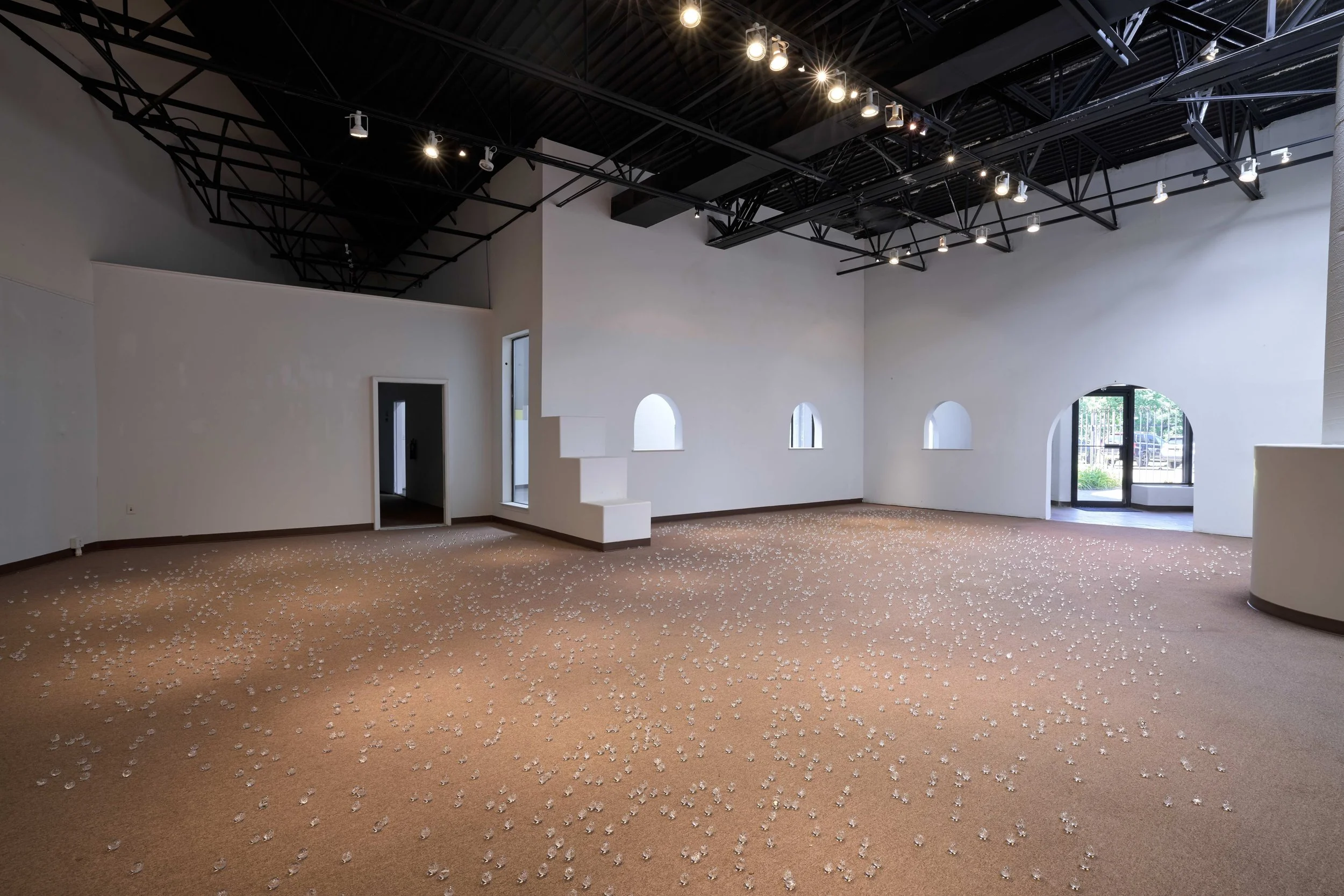 Between 1942 and 1946, at the crossroads of today’s Casa Solana neighborhood, stood a Detention and Internment Camp confining over 4500 Japanese resident aliens. To commemorate each immigrant, the artist—a descendant of this infamy-- gathered grains of sand from the adjacent river bed. Crossing the haphazardly flung orbs to enter the next room, the visitor must perilously slip and slide between their uncontrollable movements-- just as the incarcerated men groped their way through psychic disorientation and