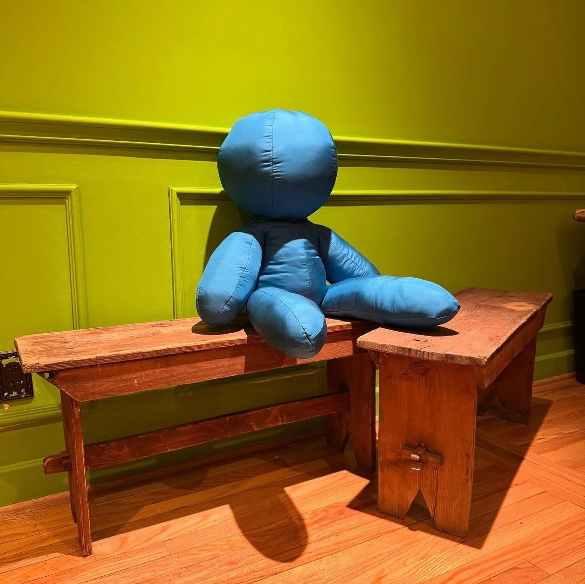 In the green back lounge of a fragrant cannabis shop, the amazed visitor assumes she is lost in a storage room for baby-sized stuffed dolls. Haphazardly seated, fallen, flopping, bending, lying, lopsided or erect, weirdly twinned or alone, they are everywhere. What is this druggy place? What is being awaited by these piles of ineffable stuff: shipping, remaindering, shelving, or simply cast aside? Hardly voluptuous, despite their curvy contours, Omari Douglin-- with the help of a toymaker—styles these pudgy consumer oddities in farmer’s checked overalls, aprons, pinafores, pinstriped jackets, green shirts, yellow vests, or slacks beneath an actual, geographical world -globe stomach. Topping this tasteless fashion are red or brown or black google-eyed capped or hatted bowling-ball heads. Made and sewn from cardboard, paper, glue, wire, mixed fabric, foam, paint, they stagger the mind. Are they thought-jokes or satires on the business of self-presentation?
